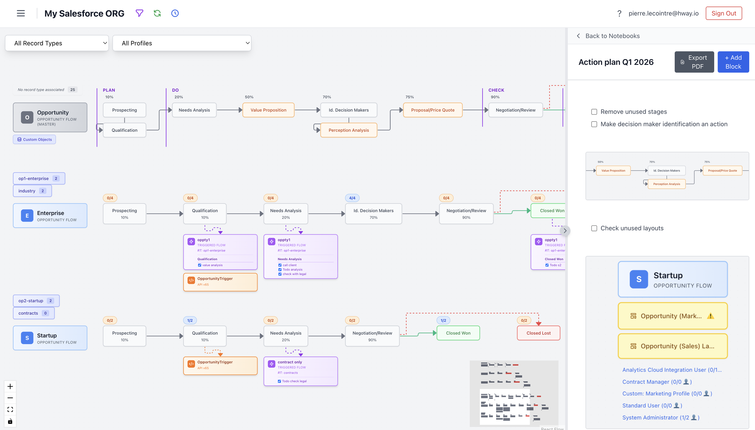 As your business scales, your CRM becomes a labyrinth of hidden dependencies. Triggers, record types, layouts, flows or rules often conflict, creating a "black box" where no one truly knows how a lead becomes a customer. Stood Flows acts as a mirror for your business logic, pulling back the curtain to reveal exactly how your system is wired. By turning abstract settings into a living map, we eliminate the guesswork that keeps Sales Ops and Architects awake at night.